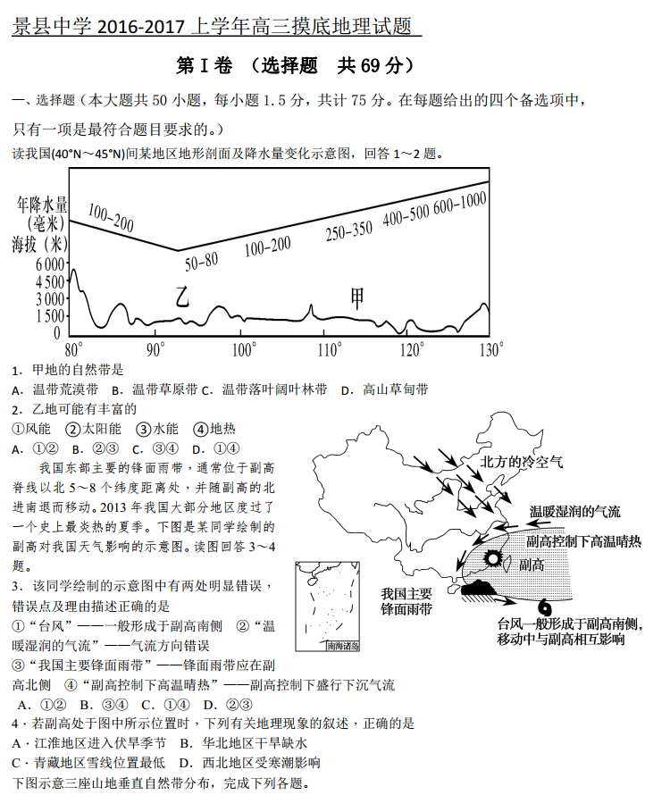 河北景县中学2017届高三上学期摸底考文综地理试题及答案