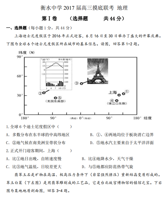 河北衡水中学2017届高三摸底联考文综地理试题及答案