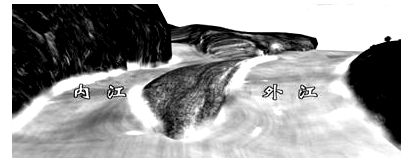 秦国蜀郡守李冰,在岷江中游修筑都江堰。这个工程采取中游作堰的方法把岷江水分为内江和外江。内江供灌溉,外江供分洪,控制了岷江激流,使水势转为平缓,既免除了水灾,还能灌溉300多万亩农田。读都江堰内外江模拟景观图(图1),回答4~5题。