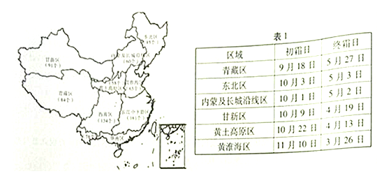 图3示意我国农业区及气象站点(数量)的分布,表I示意我国部分农业区初、终霜日出现的时间。据此完成9——11题。
