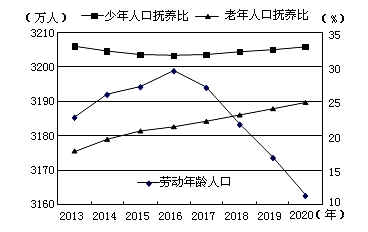 37.(24分)图6示意我国中部某省三项常住人口统计及预测数据,其中抚养比是指总体人口中非劳动年龄人口与劳动人口数之比。读图,完成下列要求。