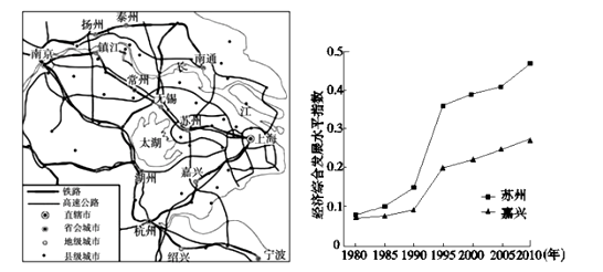 (2)苏州和嘉兴与城市群首位城市上海距离相近,自然条件与农业基础相似,分析近年来两城市经济发展的差异及其成因。(5分)