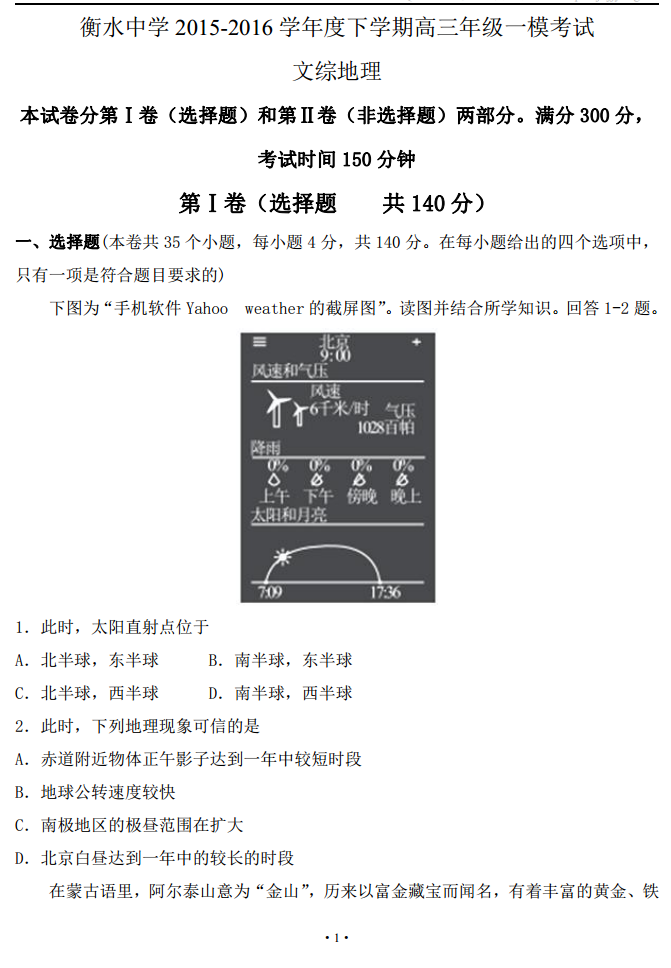 2016河北衡水市高三下学期一模文综地理试卷及答案
