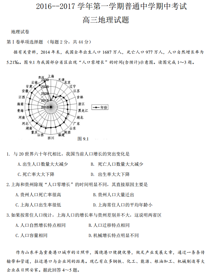 河北承德市2017届高三上学期期中考试地理试题及答案