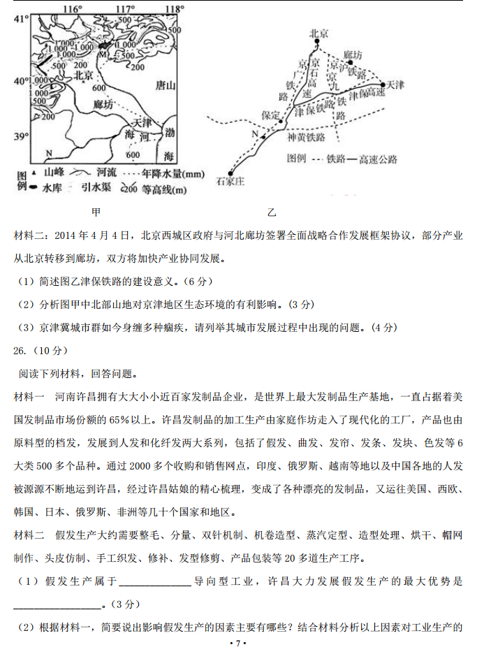 河北承德市2017届高三上学期期中考试地理试题及答案(7)