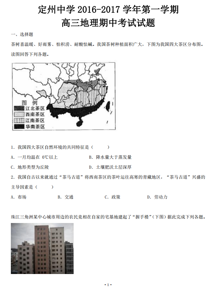 河北定州中学2017届高三上期期中考试地理试题及答案