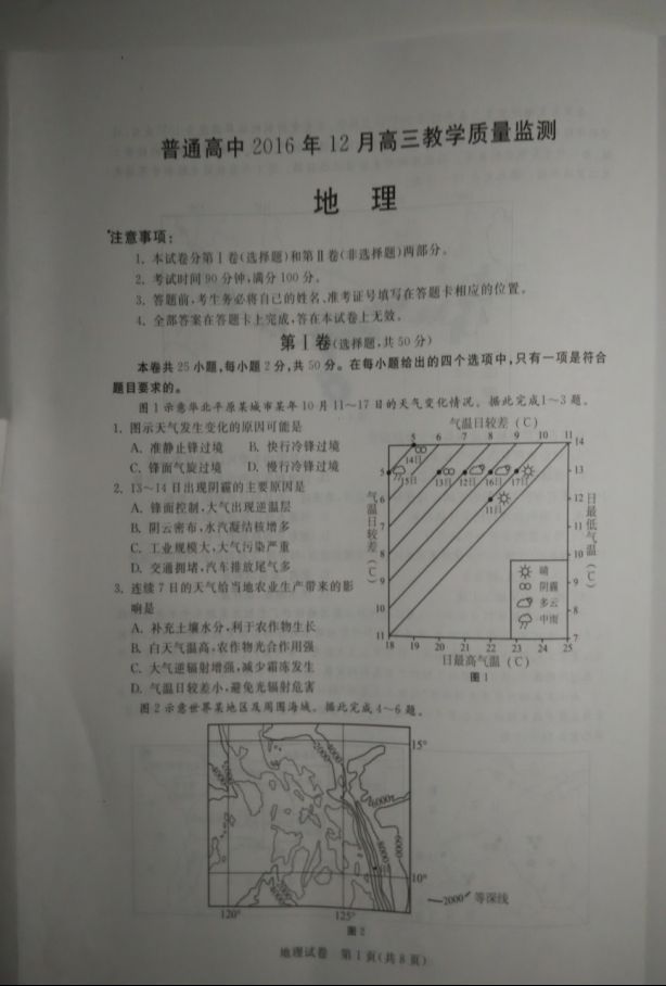 河北沧州2017届高三12月教学质量监测地理试题及答案