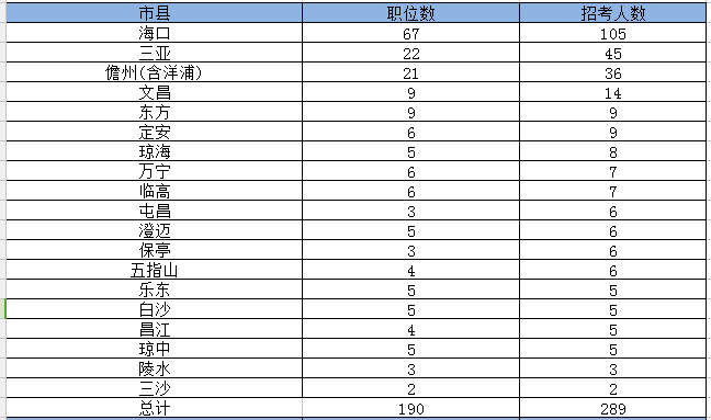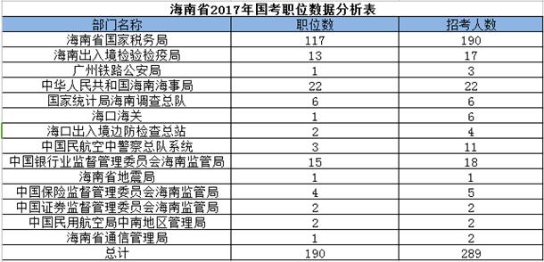 2017年国家公务员考试月10月13日正式启动。本次考试海南共有14个部门参加招录考试,提供190个职位,共招录289人,相比2016年国考海南地区招录人数减少了18人,本次考试海南地区国税局招录人数最多为190人,占海南地区招录人数66%,海南省海事局、中国银行业监督管理委员会海南监管局、海南出入境检验检疫局等单位招录人数紧跟其后,以下为海南地区招录人数情况: