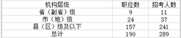 本次招录中,海南省职位表中省(含副省)级机关招录11人,占总人数的4%;市(地)级机关计划招录37人,占总人数的13%;县(区)级及以下计划招录241人,占总人数的84%,近三年来,县(区)级及以下机关的招录人数及所占比例均是最多,从以上数据可看出,基层公务员的招录比例呈现逐步增长趋国考招录向基层倾斜的力度比较明显。