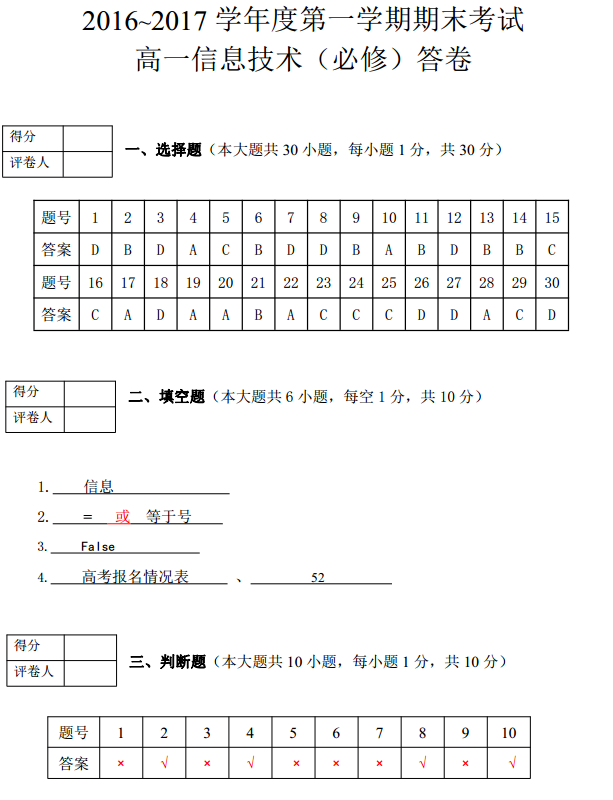 乌鲁木齐2016-2017学年第一学期期末考高一信息技试题答案