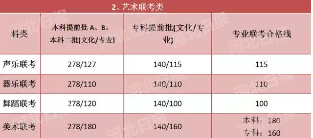 一、按教育部规定,独立设置的艺术院校和参照执行的院校(或专业)艺术类本科专业,文化、专业录取控制线由学校自行确定,河北省联考涉及到的专业,还需要河北省相应类别专业联考合格。其艺术类专科专业:河北省联考涉及的文化、专业录取控制线按河北省相应联考类执行;河北省联考未涉及的,文化控制线为140分,专业控制线由院校确定。