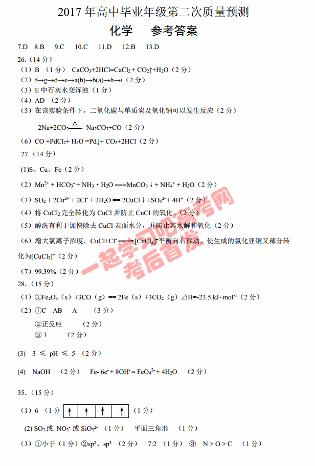2017郑州二模化学答案