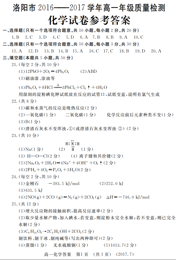 洛阳市2016-2017学年高一年级质量检测化学试题答案