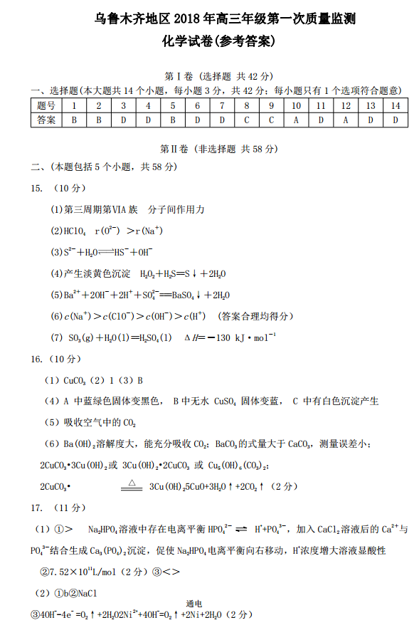乌鲁木齐2018年高三年第一次质量监测化学试题及答案
