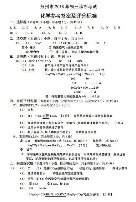 彭州市2018年初三诊断考试化学试题答案