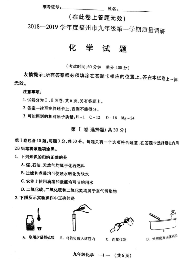 福州市2018-2019学年第一学期九年级期末质量检测化学试题答案
