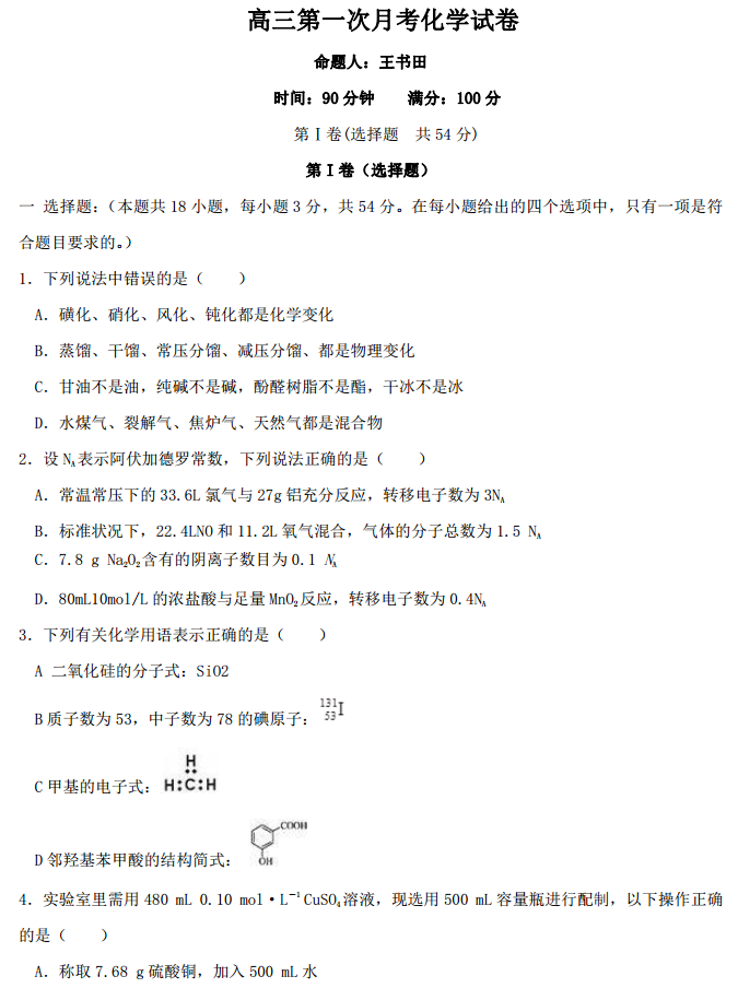 河北邯郸大名一中2017届高三上学期第一次月考化学试题及答案