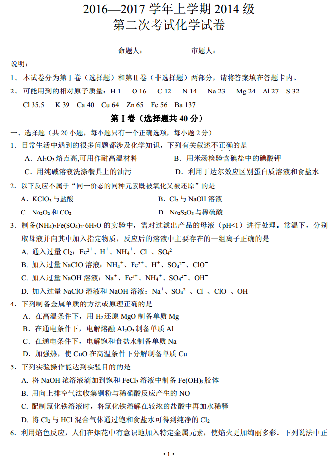 湖北沙市中学2017届高三上学期第二次考试理综化学试题及答案