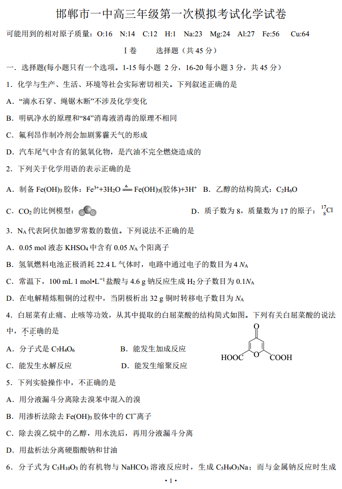 河北五个一联盟邯郸2017届高三上第一次模拟考化学试题及答案