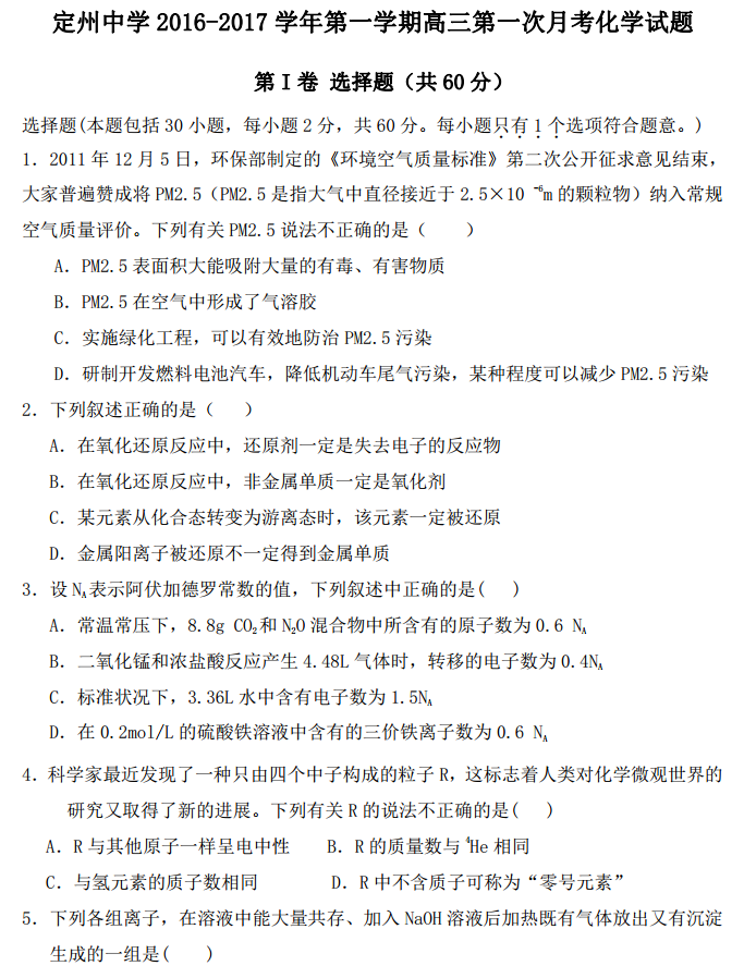 河北定州中学2017届高三上学期第一次月考理综化学试题及答案