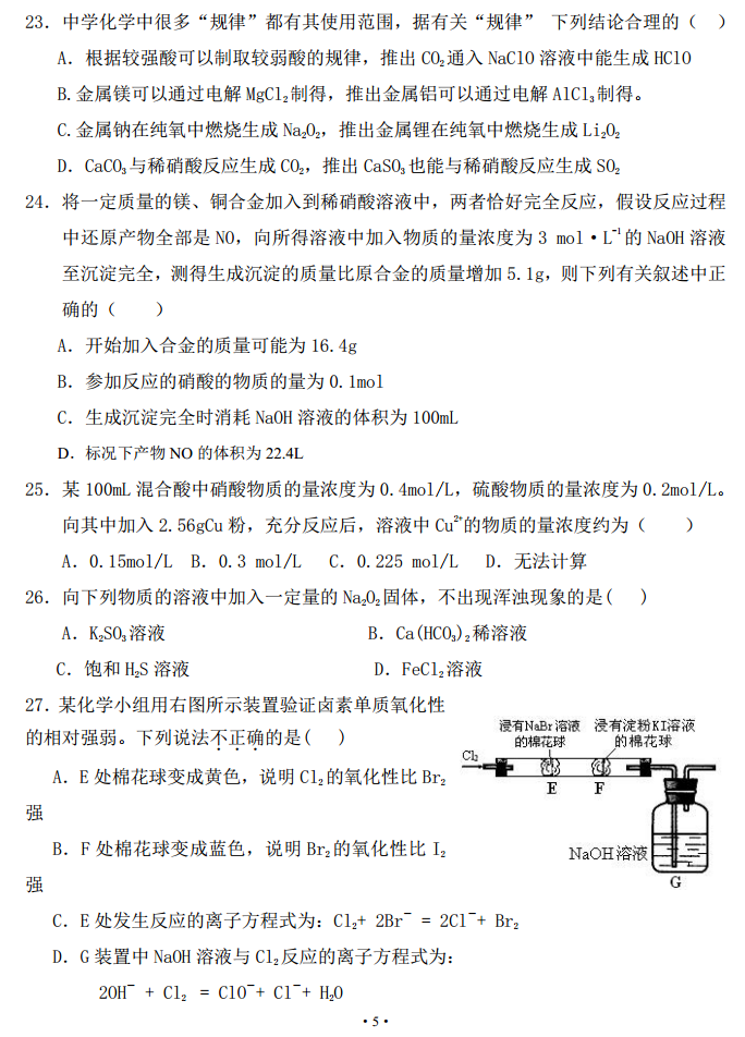 河北定州中学2017届高三上学期第一次月考理综化学试题及答案(5)