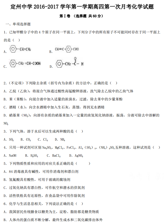 河北定州中学2017届高三高补班上学期第一次月考化学试题答案