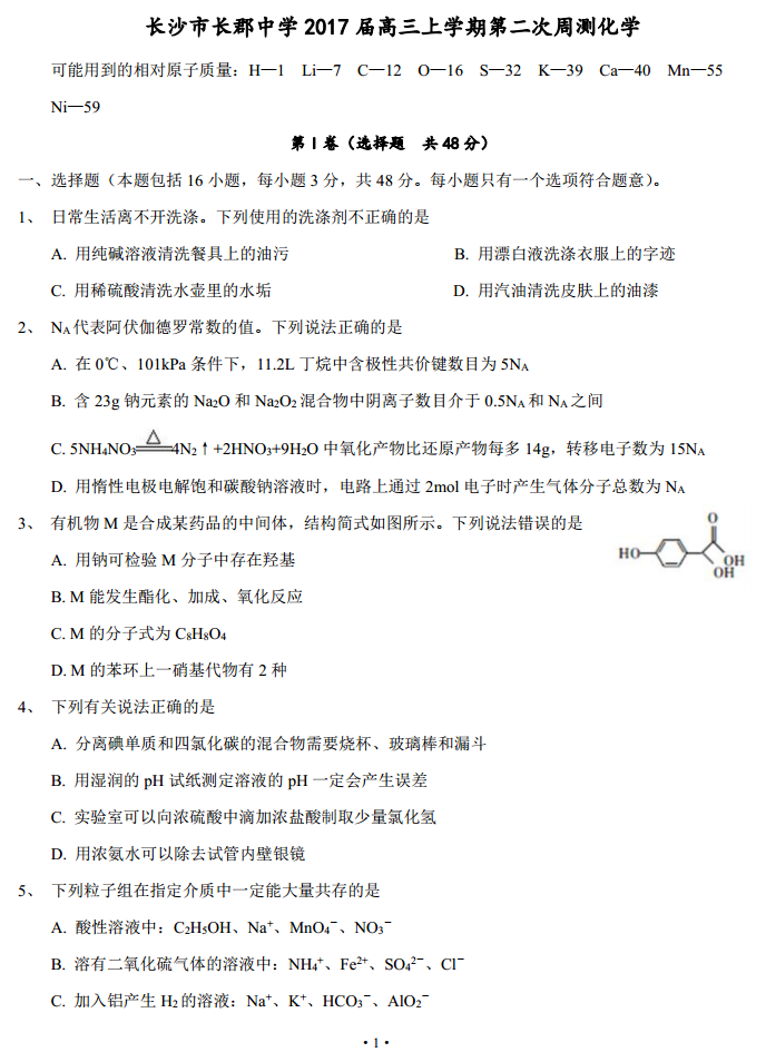 湖南长沙长郡中学2017届高三上学期第二次周测化学试题答案