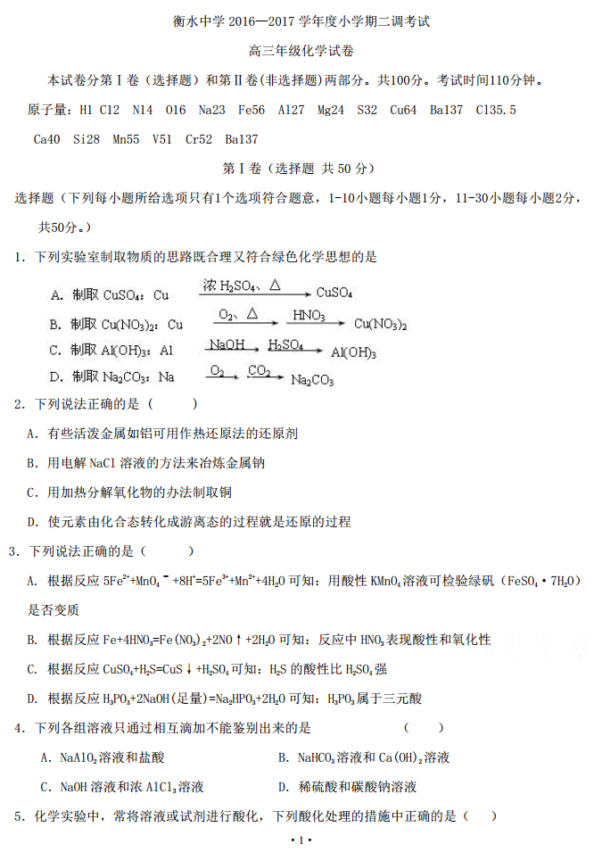 河北衡水中学2017届高三上学期小二调考试理综化学试题答案