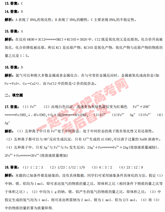 河北故城县高级中学2017届高三上期第一次月考化学试题答案(10)