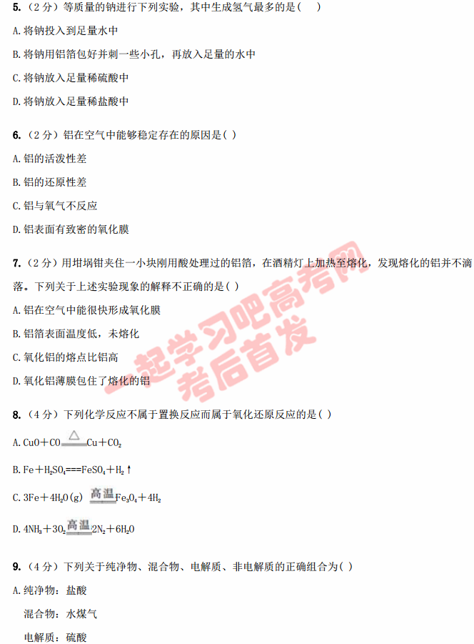 河北故城县高级中学2017届高三上期第一次月考化学试题答案(2)