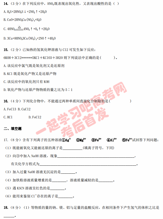 河北故城县高级中学2017届高三上期第一次月考化学试题答案(5)