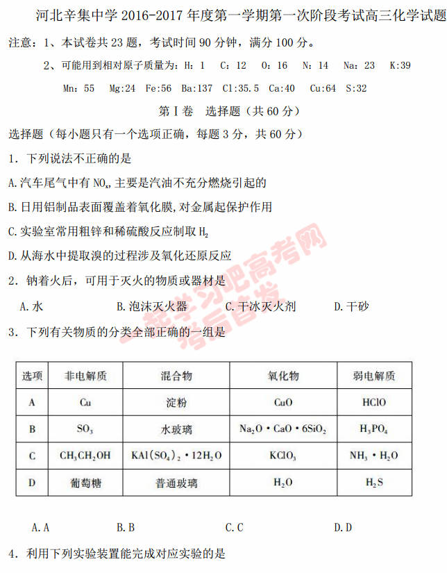 河北石家庄辛集中学2017届高三上第一次阶段考化学试题及答案