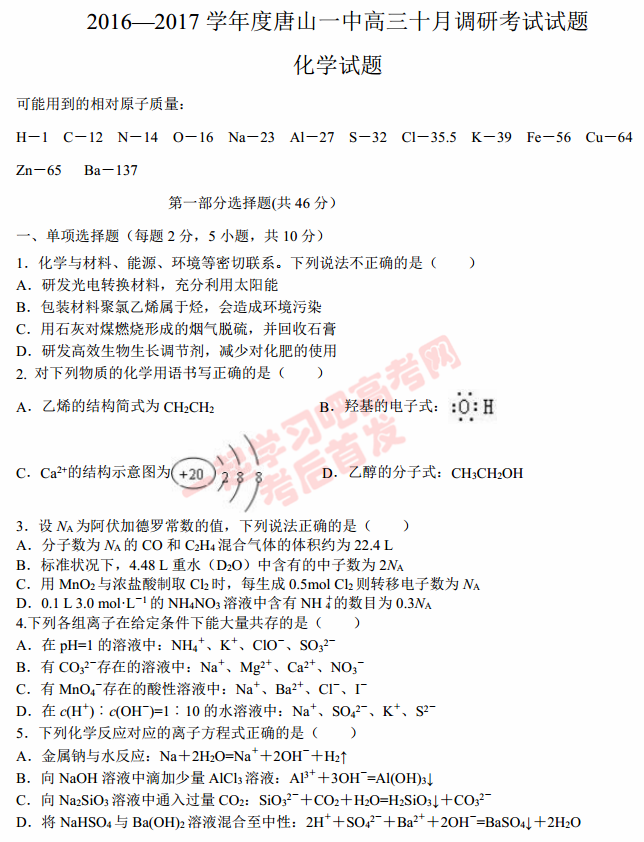 高中化学模拟题 http://www.ajrhws.com/hx/