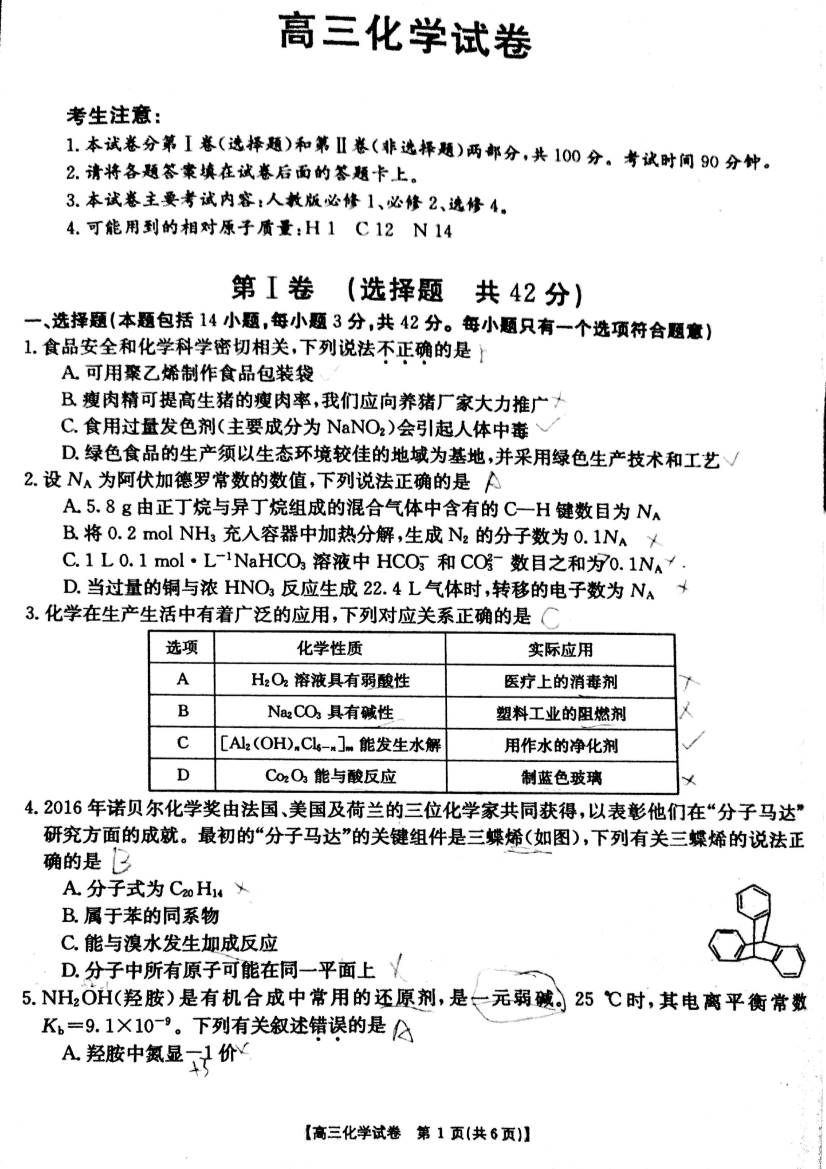 河南河北名校2017届高三第二次省际联考化学试题及答案