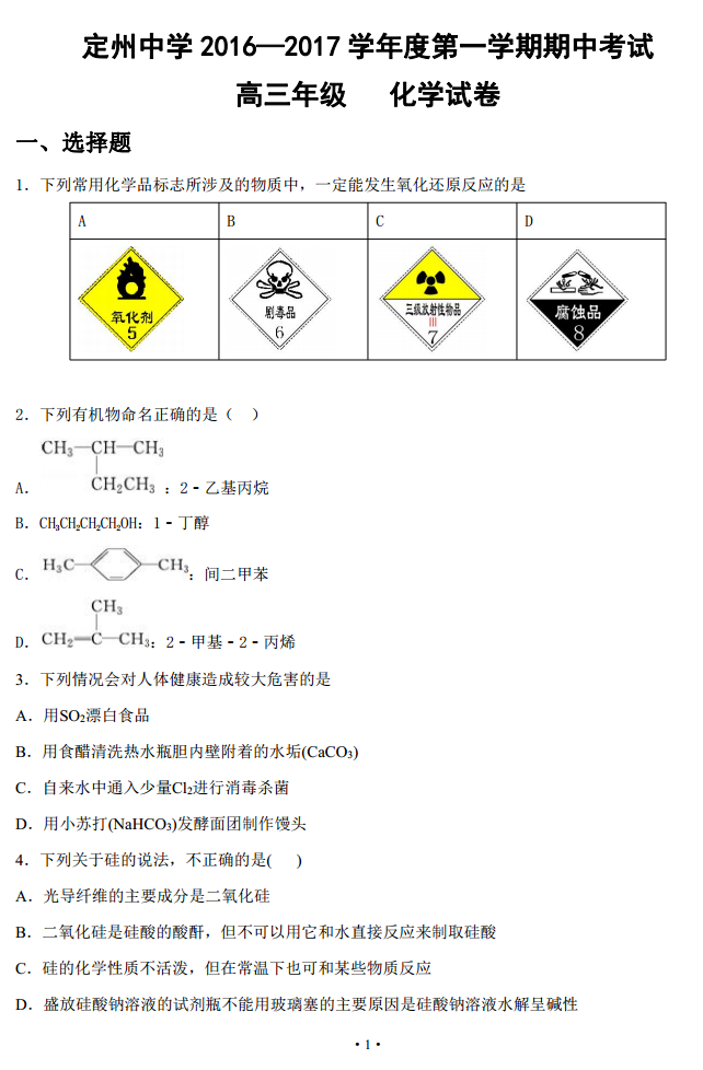 河北定州中学2017届高三上期期中考试化学试题及答案