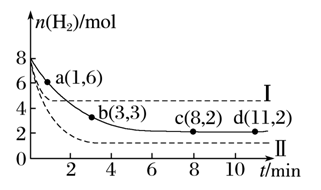 2的物质的量随时间变化如右图中实线所示(图中字母后的数字表示对应的坐标)。该反应在8~10min内CO