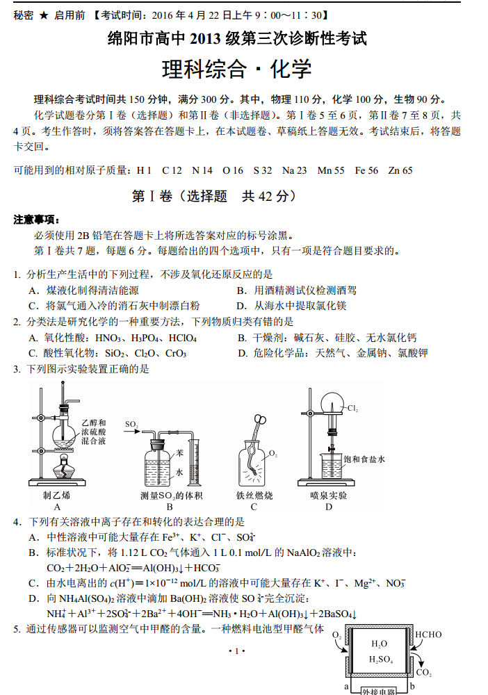 绵阳高中2013级第三次诊断性考试理综化学试题及答案