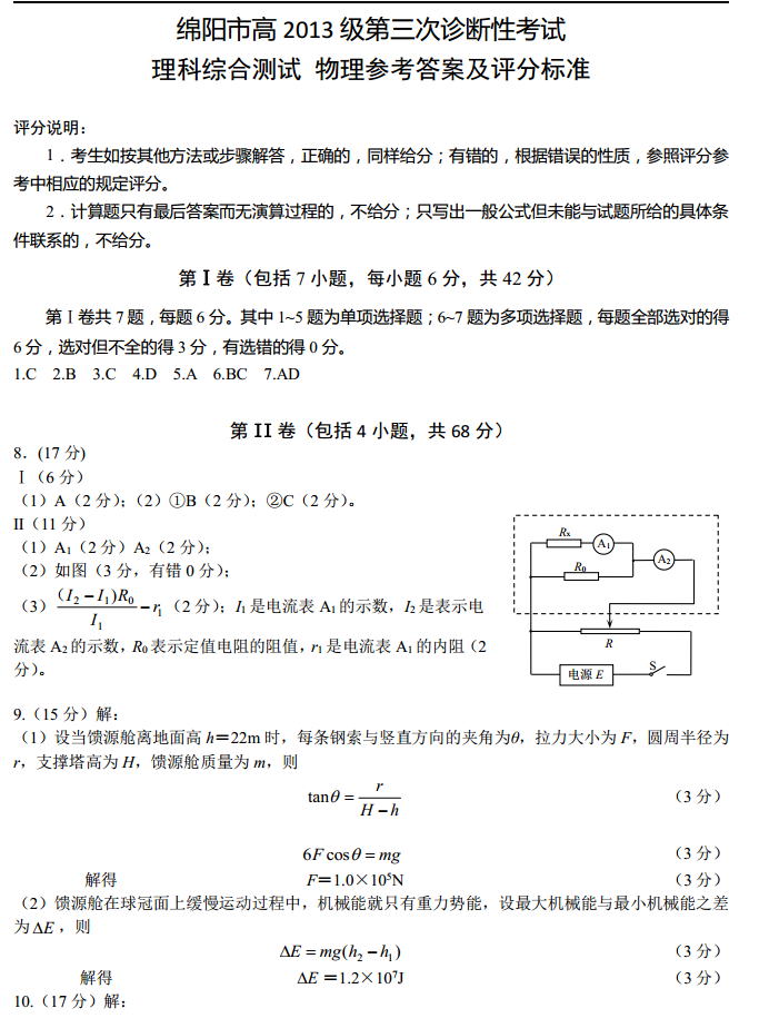 绵阳高中2013级第三次诊断性考试理综化学试题及答案(10)