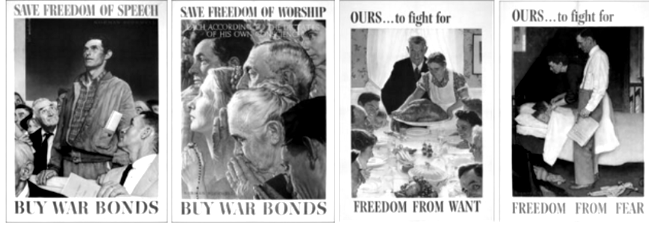 材料 下图是美国画家诺尔曼·罗克威尔1942年创作的作品《四大自由》,其内容反映了罗斯福总统1941年提出的“言论自由、信仰自由,免于贫困的由由和免于恐惧的自由”。该画的出版引起了巨大反响,美国财政部在16个城市举行画作的巡回展,以推销美国战争公债。宣传画发行了四百多万份,募集到一亿三千九百多万美元。1948年联合国通过的《世界人权宣言》以罗斯福的“四大自由”为感召,重建战后的世界。直至今天它们仍然,也应该继续影响世界和平与自由的进程。