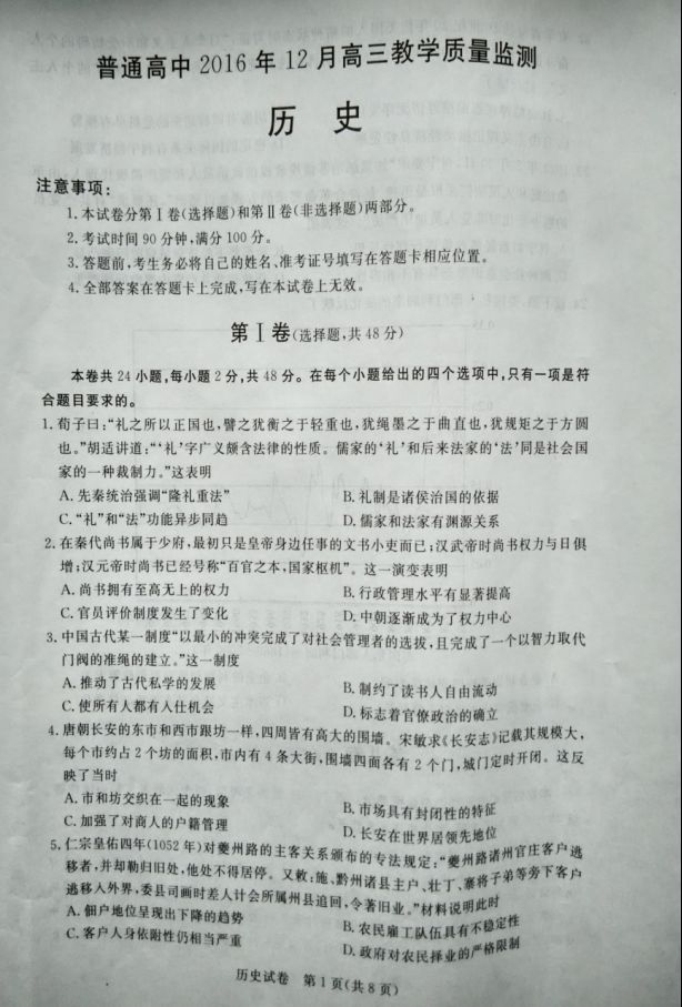 河北沧州2017届高三12月教学质量监测历史试题及答案