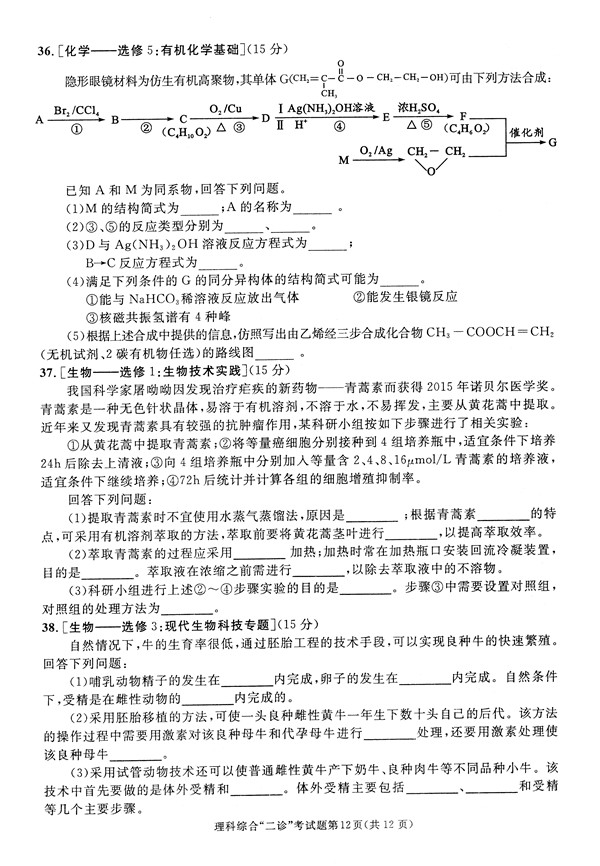 2017年成都二诊理综试题及答案(12)