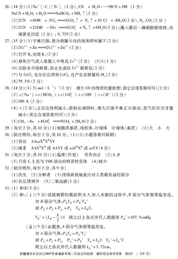新疆维吾尔自治区2017届高三第二次适应性检测理综答案(2)