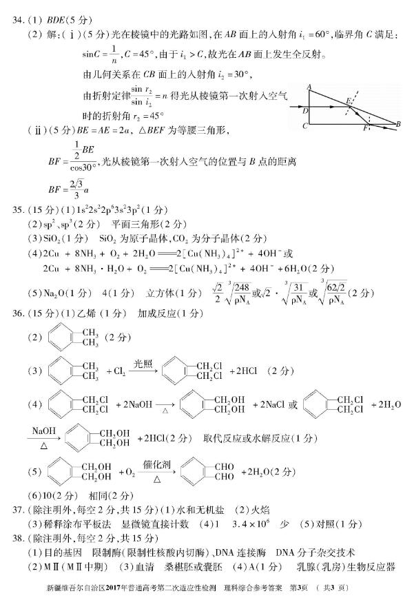 新疆维吾尔自治区2017届高三第二次适应性检测理综答案(3)