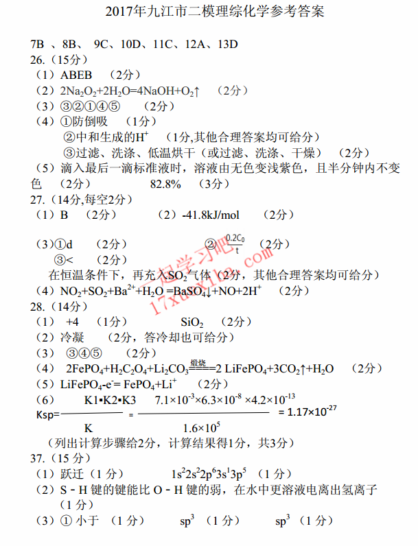 九江市2017年第二次高考模拟统一考试理综试题及答案(2)