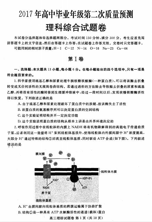 2017郑州高中毕业班第二次质量预测理综试题及答案