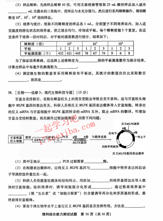 2017年4月福建省高三质量检查理综试题答案(16)