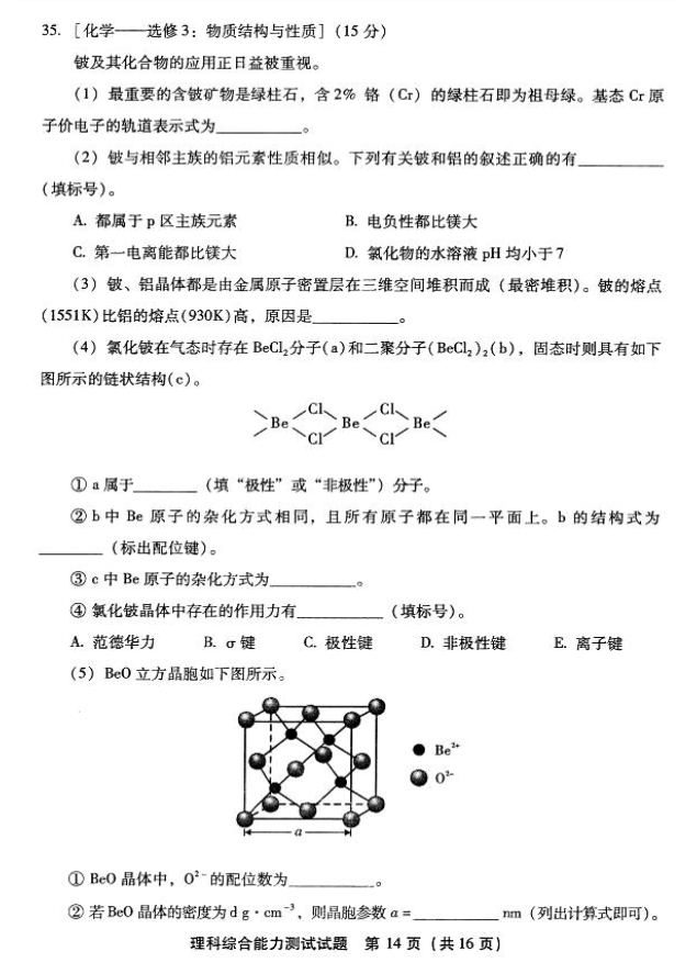 2017年福建普通高中毕业班质量检查理综试题及答案(14)