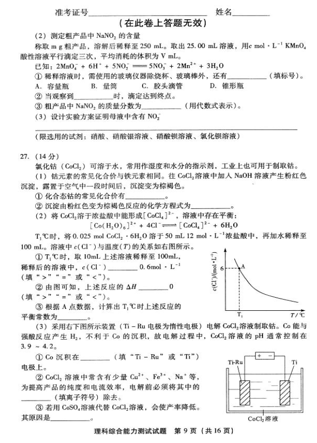 2017年福建普通高中毕业班质量检查理综试题及答案(9)