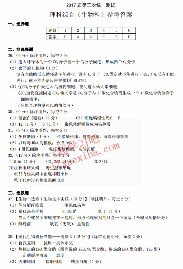 肇庆2017届毕业班第三次教学质量检测理综试题及答案(4)