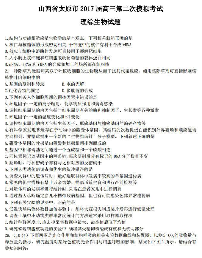 2017太原二模理综试题及答案